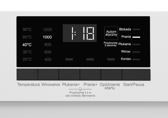 Dodatkowe funkcje, takie jak dołożenie prania w trakcie cyklu, autoczyszczenie bębna, opóźnienie startu czy dodatkowe płukanie, zwiększają komfort użytkowania i pozwalają w pełni dopasować cykl prania do indywidualnych potrzeb. Wyświetlacz LED ułatwia monitorowanie postępu prania oraz wybór odpowiedniego programu, a blokada panelu sterowania (blokada rodzicielska) zapewniają bezpieczeństwo, szczególnie w domach z dziećmi.
