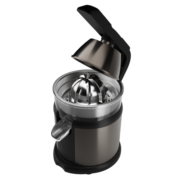 Obudowa, stożek, filtr oraz pokrywa zostały wykonane z trwałej stali nierdzewnej, co sprawia, że urządzenie nie tylko prezentuje się elegancko, ale jest również odporne na intensywne użytkowanie i łatwe w czyszczeniu. Regulowany filtr pozwala dostosować poziom miąższu do indywidualnych preferencji – od klarownego napoju po gęsty, pełnowartościowy sok.