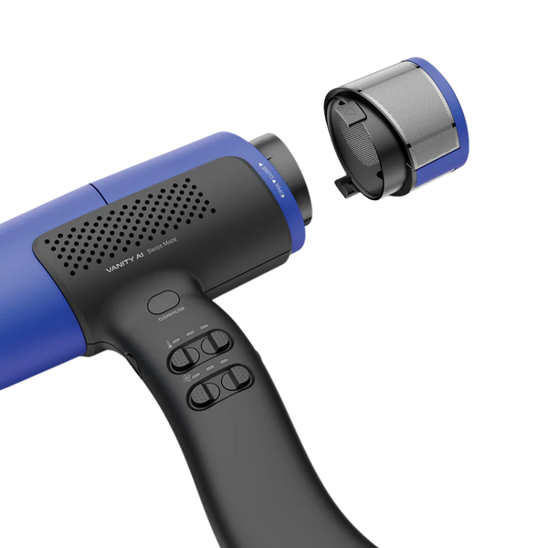 Vanitycare AI oferuje zaawansowane rozwiązania technologiczne, takie jak generator jonów oraz Auto-Clean Technology, automatycznie czyszcząca filtr po naciśnięciu przycisku. Urządzenie posiada wyjmowany metalowy filtr oraz alert CLEAN FILTER przypominający o jego konserwacji. W zestawie znajduje się ekskluzywna końcówka Touch Me (8,2 cm), która pozostaje chłodna w dotyku nawet podczas intensywnej pracy.