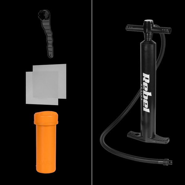 W zestawie: pompka ręczna, plecak transportowy, zestaw naprawczy (klucz do zaworu, łatki naprawcze, klej)
