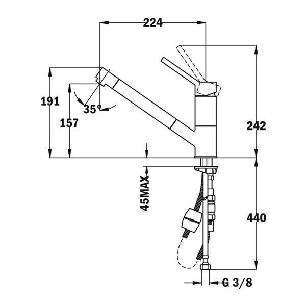 - chrom, bateria mieszakowa, ruchoma wylewka obracalna o 180 stopni, wyciągana wylewka, anti-scale w perlatorze, głowica z zaworem ceramicznym, otwór na baterię 35mm, wysięg 224mm, wysokość 157/242mm