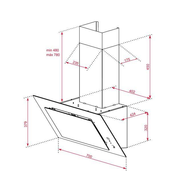 - 70cm, przyścienny, klasa A+, sterowanie sensorowe, pochłaniacze szczelinowe, 3+1 prędkości turbiny, timer, wskaźnik zabrudzenia filtrów, oświetlenie LED, filtry metalowe, 698m3/h, INOX + czarne szkło