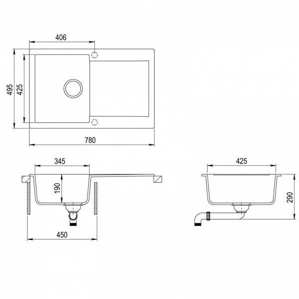 - tequarc: grafit, wymiary zew 780x495mm, wielkość komory 345x425x190mm, kpl odpływowy z automatem zamykającym z zaworem 3 1/2" z przedłużką i syfonem, do szafek 45cm