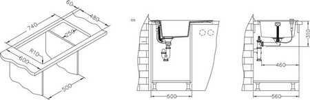 - Wymiary wycięcia w blacie: I 740x480