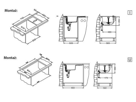 Wymiary wycięcia w blacie: I 740x480 mm U 681x422 mm