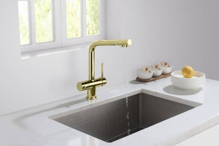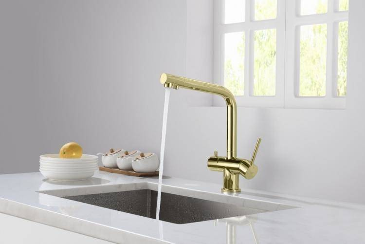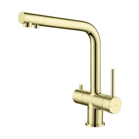 - BATERIA 4-DROŻNA Z PODŁĄCZENIEM DO WODY FILTROWANEJ:– wykończenie: kolor ZŁOTY– wylewka obrotowa do 360°– głowice ceramiczne– 2 elastyczne wężyki podłączeniowe 3/8“ – 400 mm– 2 podłączenia do filtra z szybkozłączką (do wody filt
