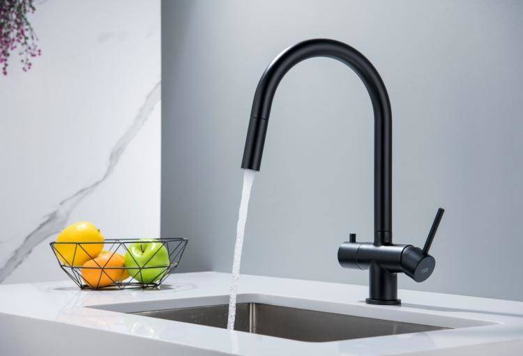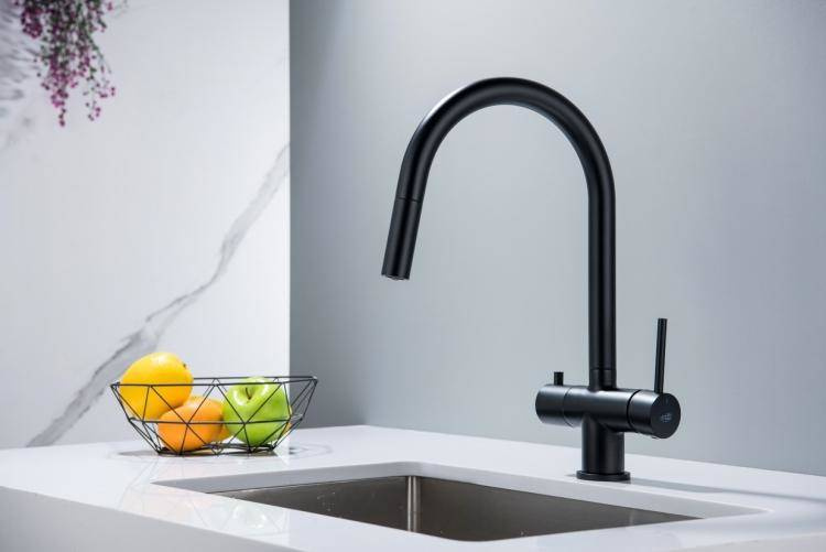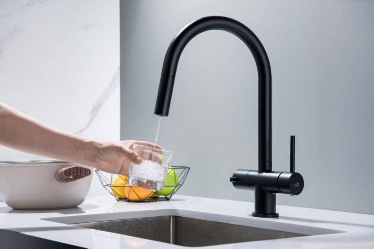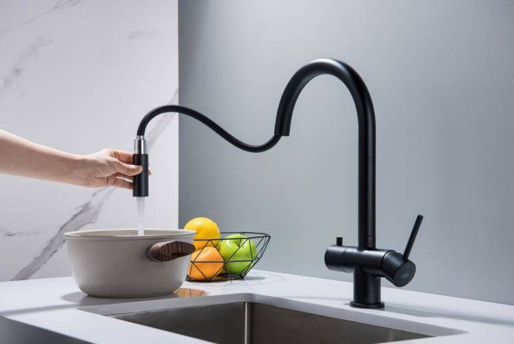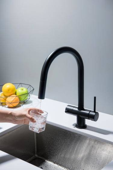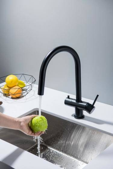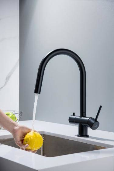 - BATERIA Z PODŁĄCZENIEM DO WODY FILTROWANEJBATERIA Z WYCIĄGANĄ WYLEWKĄ - ABSOLUTNA NOWOŚĆ!Zintegrowany magnes umożliwiający szybkie chowania końcówki wylewki– wykończenie: CZARNY MAT– wylewka obrotowa do 360°– głowice ceramiczne– 2 elastyczne wężyki p