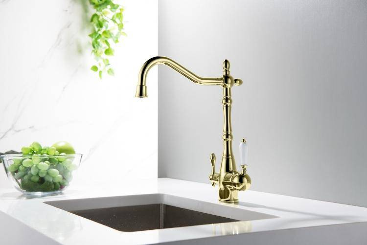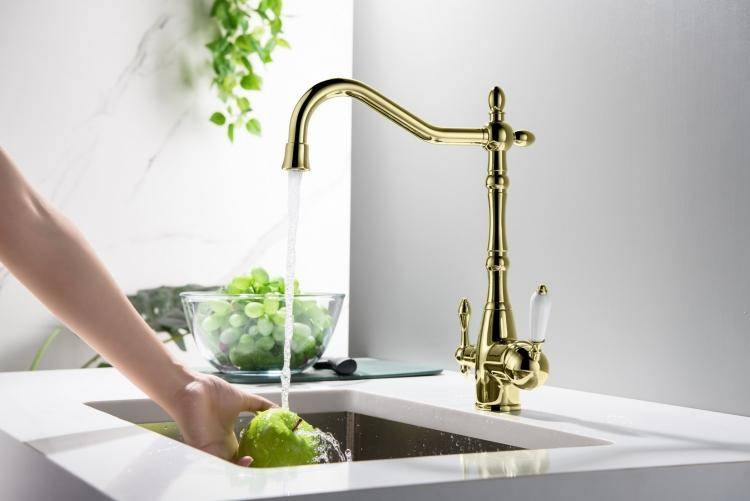 - BATERIA Z PODŁĄCZENIEM DO WODY FILTROWANEJ– wykończenie: kolor ZŁOTY– wylewka obrotowa do 360°– głowice ceramiczne– 2 elastyczne wężyki podłączeniowe 3/8“ – 400 mm– rurka z szybkazłączką na końcuBATERIA Z DWOMA NIEZALEŻNYMI OBWODAMI:– mieszacz wody