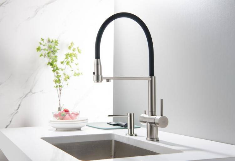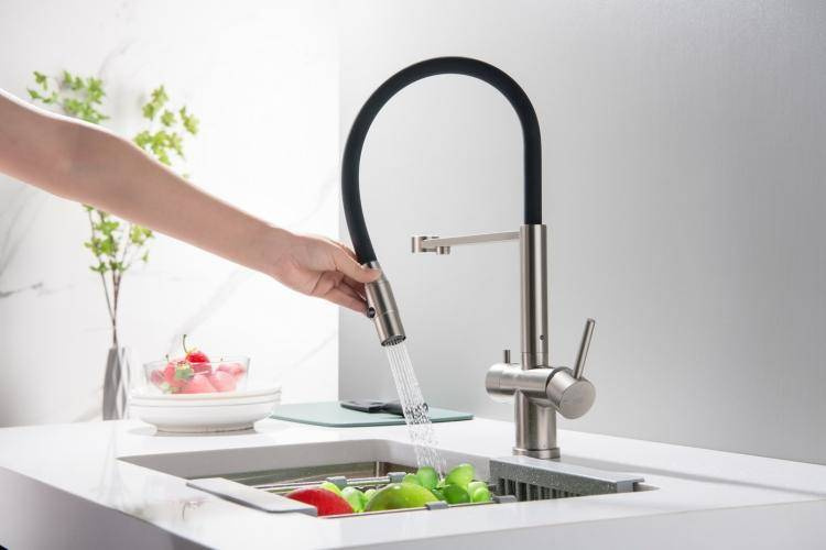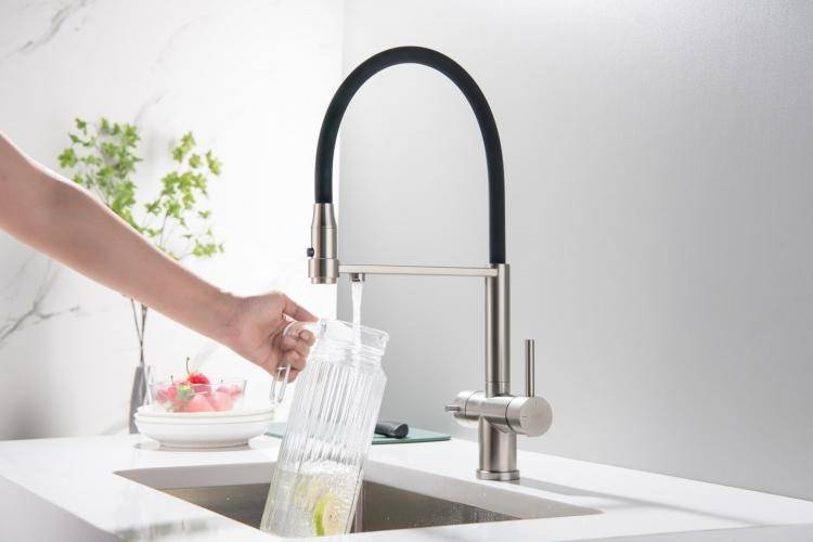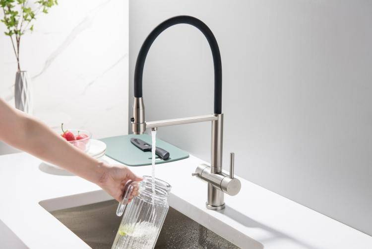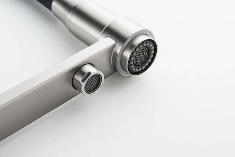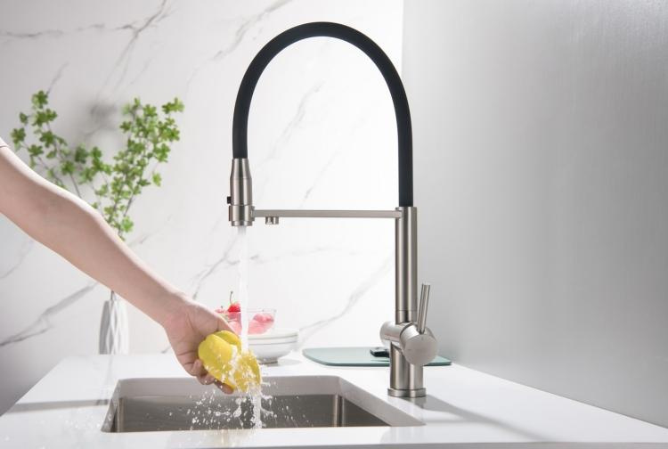 - BATERIA Z PODŁĄCZENIEM DO WODY FILTROWANEJBATERIA Z WYJMOWANĄ WYLEWKĄ!WYLEWKA Z PRZEŁĄCZNIKIEM STRUMIENIA WODY!– wykończenie: kolor STALI– material: mosiądz– wylewka obrotowa do 360°– głowice ceramiczne– 2 elastyczne wężyki podłączeniowe 3/8“ –