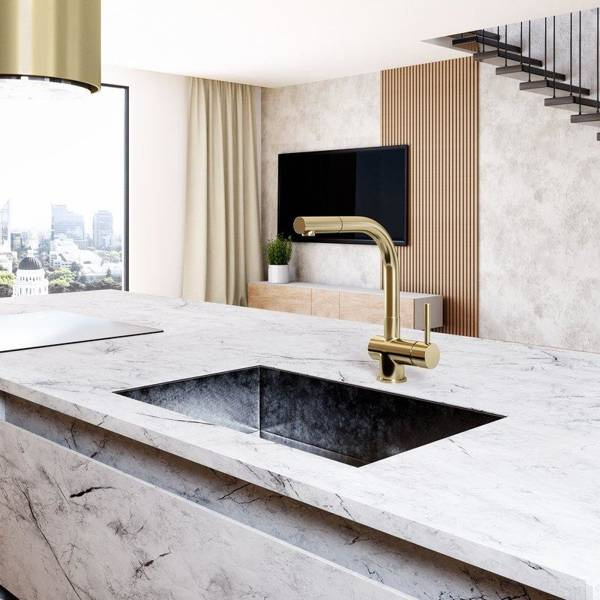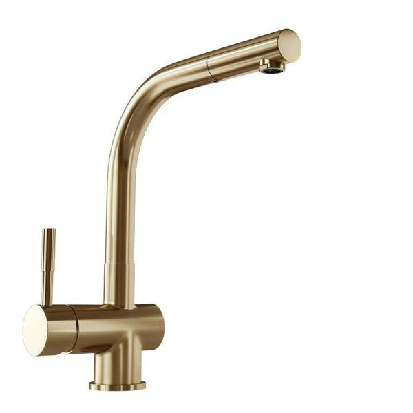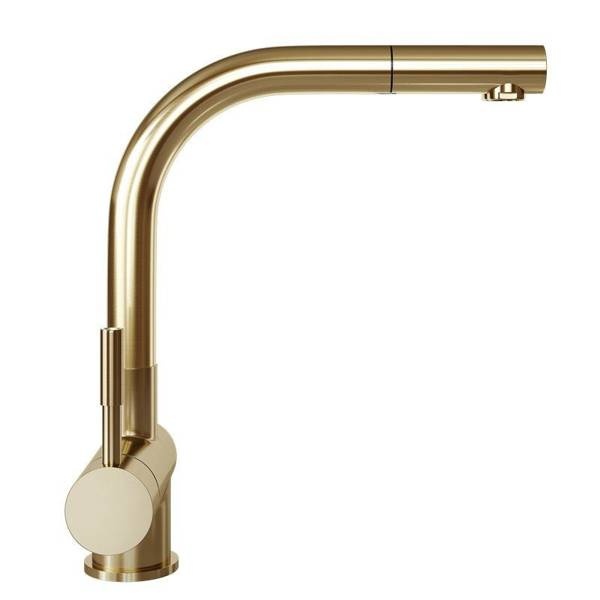 Krótki opis: bateria kuchenna w wyciąganą wylewką. Wykonanie: mosiądz. Uchwyt: stop cynku. Linia: EXCLUSIVE Złota bateria z wyciąganą wylewką Bateria kuchenna Lobio Light Gold Mat zachwyca pięknym designem i funkcjonalnością. Została wykonana z dbałością o szczegóły, dlatego doskonale uzupełni kuchenną przestrzeń. Ogromną zaletą baterii jest wyciągana wylewka z solidnym mocowaniem, która pozwoli zadbać o najwyższy komfort zmywania. Elegancki, stylowy kształt i kolor jasnego złota sprawiają, że bateria znajdzie zastosowanie zarówno w nowoczesnych, jak i klasycznych kuchniach. Zestaw zawiera: bateria, wężyki, zestaw mocujący, uszczelki. Zalety i korzyści dla użytkownika Wygodna w użytkowaniu - Lobio to bateria z wyciąganą wylewką. Dzięki tej funkcji możesz skierować strumień wody, tam gdzie tego potrzebujesz. Wygodnie umyjesz naczynia, sprzątniesz strefę wokół zlewu, czy napełnisz wysoki garnek wodą. Wyjątkowe wzornictwo - bateria zlewozmywakowa Lobio jest wykończona w kolorze złotym, dlatego będzie eleganckim akcentem w kuchni. Trwała konstrukcja - zastosowany do produkcji baterii mosiądz cechuje się wysoką odpornością, co pozwoli użytkować baterię przez długie lata. Malowanie metodą PVD zwiększa odporność na zarysowanie, dzięki czemu przy odpowiedniej pielęgnacji nawet po długim czasie bateria będzie prezentować się jak nowa. Przeznaczenie: Bateria przeznaczona jest do użytku ze zlewozmywakami kuchennymi. Może być również montowana bezpośrednio na blacie. Materiały: Bateria została wykonana z mosiądzu malowana metodą PVD na kolor jasnego złota. Dobrze wiedzieć! Bateria Lobio Light Gold Mat pasuje do okapów kuchennych GLOBALO w odcieniu Light Gold Mat: Cylindro Isola 39 Light Gold Mat, Heweno 39 Light Gold Mat ID#456
