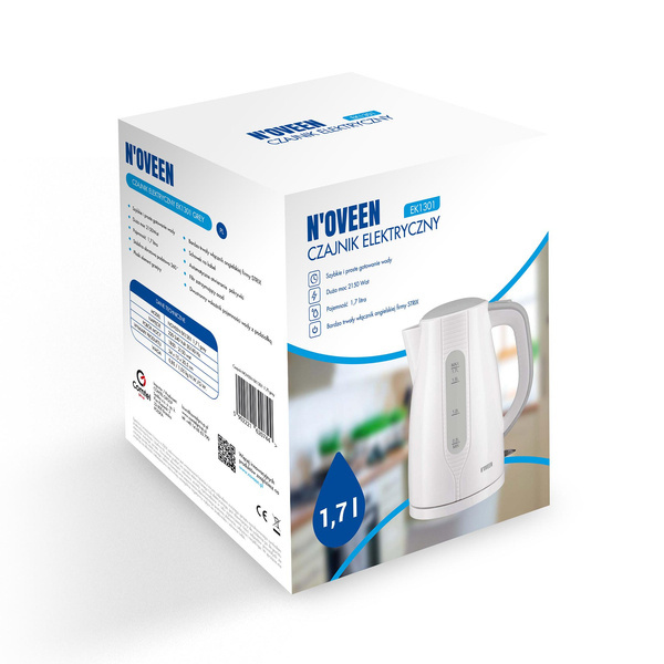 - Czajnik elektryczny N'oveen EK1301 został wyposażony w stabilną obrotową podstawę 360°, która zapewnia komfort użytkowania. Czajnik wyposażony został w filtr zatrzymujący osad, schowek na kabel oraz trwały włącznik angielskiej firmy STRIX. Cechy produktu: