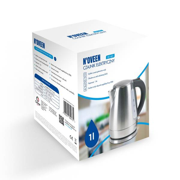 - Czajnik elektryczny N'oveen EK1401 INOX został wyposażony w stabilną obrotową podstawę 360°, która zapewnia komfort użytkowania. Czajnik wykonany jest ze stali szlachetnej INOX (obudowa), posiada również filtr zatrzymujący osad, schowek na kabel oraz trwa