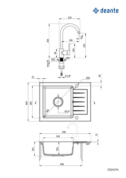 Zlewozmywak granitowy z baterią 1-komorowy z ociekaczem (ZQZA211A) - Deante