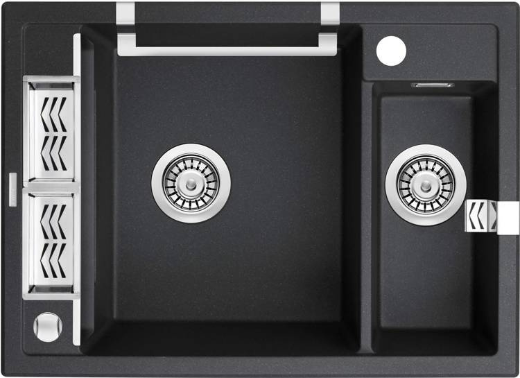 Zlewozmywak granitowy magnetyczny jest to bardzo pomysłowe rozwiązanie. Dzięki wbudowanym magnesom i stalowej maskownicy część bocznej półki może zostać wykorzystana na zwiększenie użyteczności. Powszechnie wiadomo, że w suchym środowisku drobnoustroje nie rozwijają się zbyt szybko, dlatego proponujemy także dedykowane akcesoria uzupełniające. Do ściśle przylegających koszyczków z ażurowym dnem włożysz sztućce, a ściereczkę czy zmywak kuchenny powiesisz do odsączenia na uchwytach. Zlewozmywak granitowy magnetyczny jest odporny na przebarwienia, uderzenia i wysoką temperaturę, zgodnie z normą europejską PN-EN 13310. Innowacyjny, 1,5-komorowy zlewozmywak wspaniale łączy mały rozmiar i potrzebę używania więcej niż jednej komory. Mniejszą część można używać do płukania i suszenia sztućców, delikatnych kieliszków lub rozmrażania żywności. Istnieje możliwość podłączenia młynka. Projektantki Katarzyna Łogwinienko i Magdalena Paszkowska udowodniły, że nawet z pozoru zwyczajny zlewozmywak może stać się multifunkcyjnym urządzeniem kuchennym. Umiejscowiona z jednej strony półka, oddzielona maskownicą daje dodatkową przestrzeń roboczą. Produkty Magnetic można opcjonalnie wyposażyć w dedykowane tej serii koszyki, reling i haczyk, które występują w trzech wykończeniach: stal szczotkowana, bianco oraz nero.Cechy produktu: