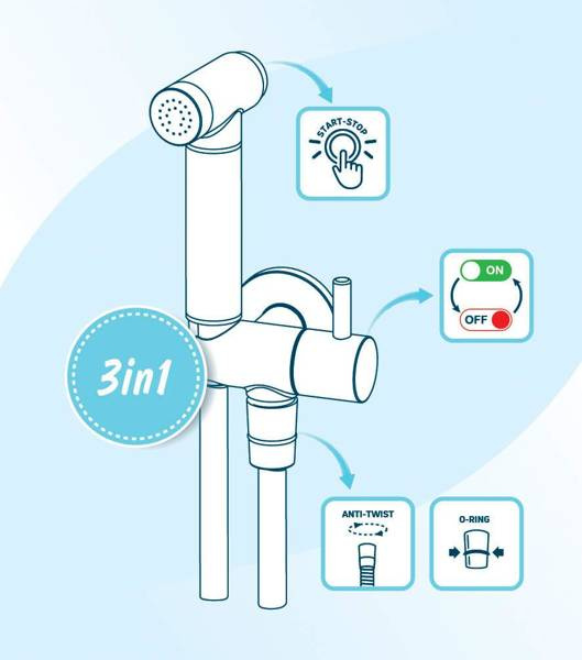 - Praktyczny zestaw bidetta 3 w 1 przeznaczony jest dla mniejszych pomieszczeń, gdzie nie ma miejsca na tradycyjny bidet. Pomaga zachować wysoki poziom higieny, ale może posłużyć też do napełniania wodą wysokich naczyń czy prac porządkowych. Słuchawka ma wy
