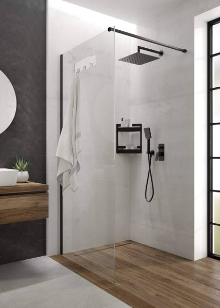 Kabina prysznicowa wykonana jest z wysokiej jakości szkła hartowanego. Jest ono bardzo odporne i sprężyste, zapewniając maksymalne bezpieczeństwo całej rodzinie. Części montażowe są estetycznie wykończone zgodnie z kolorystyką i stylistyką innych elementów z serii. Cała kabina jest bardzo przestronna. Kabina prysznicowa jest typu otwartego, nazywanego popularnie walk-in. Nie posiada tradycyjnych elementów ruchomych, przesuwanych takich jak drzwi, co niweluje ryzyko awarii na przykład rolek czy prowadnicy. Element ma 100 cm szerokości. Kolekcja Mokko została zaprojektowana z myślą o ergonomii i wieloletniej eksploatacji - tak, żeby forma dodatków zapewniała wygodę użytkowania i była ponadczasowa. Mokko to seria o prostych, geometrycznych kształtach. Akcesoria znakomicie wpisują się zarówno w stylistykę loftowa, jak i minimalistyczną. Seria obejmuje drobne dodatki, takie jak wieszaki, uchwyty i relingi, a także półki na kabiny prysznicowe i akcesoria wolnostojące. Produkty występują w dwóch wykończeniach: matowej czerni i subtelnej bieli.Cechy produktu: