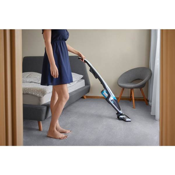 Funkcja samodzielnego stania do tymczasowego odłożenia i wygodnego przechowywania Doskonała obsługa i proste prowadzenie wokół mebli dzięki końcówce obracającej się w zakresie 180° i niskiej masie odkurzacza