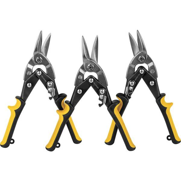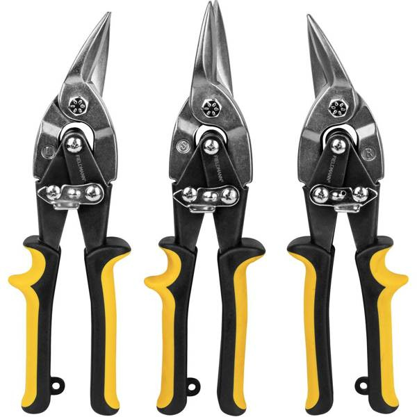 - W przypadku mniejszych prac w ogrodzie, w warsztacie lub w domu z pewnością znajdziesz zastosowanie tego 3-częściowego zestawu nożyc do blachy FIELDMANN. Zestaw zawiera nożyce do cięcia po prawej, lewej i prostej stronie arkuszy i twardych materiałów, rur