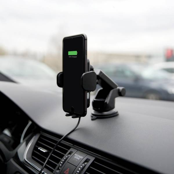 - W pełni automatyczny uchwyt samochodowy z certyfikowanym ładowaniem bezprzewodowym Qi i obsługą szybkiego ładowania