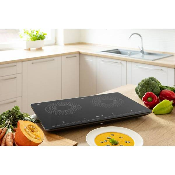 Ceramiczna płyta indukcyjna nie nagrzewa się, ciepło wytwarza się wyłącznie w naczyniu na skutek działania indukcji (uwaga, płyta może częściowo się zagrzać od naczynia do gotowania). Oszczędność czasu (60 %) i energii el. (50 %) podczas gotowania indukcyjnego. Posiada bardzo dużą sprawność (nawet 90 %) i minimalne straty cieplne.