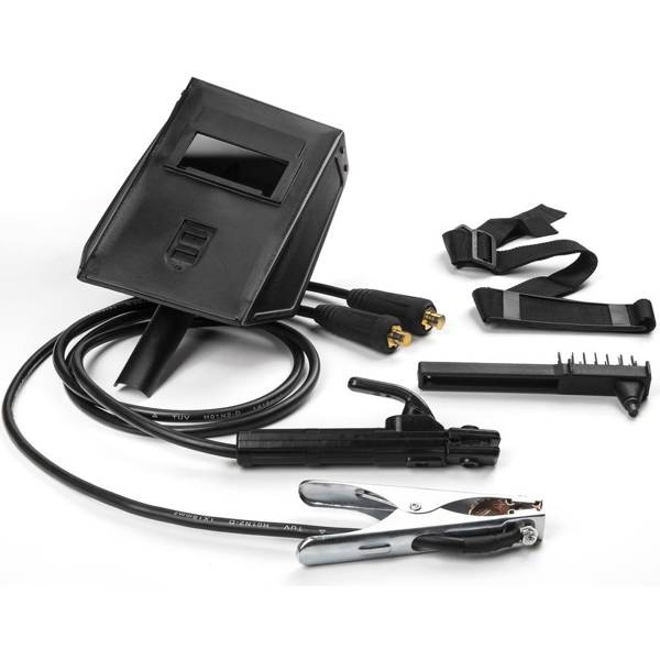 W zestawie praktyczny przyłbica spawalnicza, kabel spawalniczy do elektrod oraz kabel uziemiający
