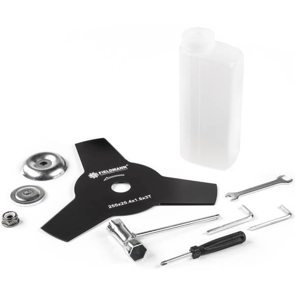 W zestawie: podkaszarka, półautomatyczna głowica tnąca z nylonową żyłką, 3 płaszczyznowe metalowe ostrze, pasek, instrukcja obsługi