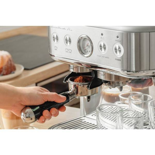 Akcesoria: Uchwyt na filtr, miarka, 2 filtry (na 1 i 2 filiżanki), dzbanek na mleko, zestaw czyszczący, tamper