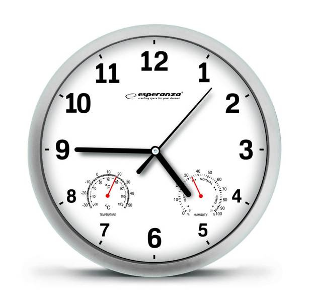 - Nasz zegar ścienny Esperanza LYON służy nie tylko do pokazywania czasu - można na nim odczytać też temperature oraz wilgotność otoczenia. Jego wzornictwo sprawia, iż udekorujesz nim każde mieszkanie, biuro, sklep czy restaurację.