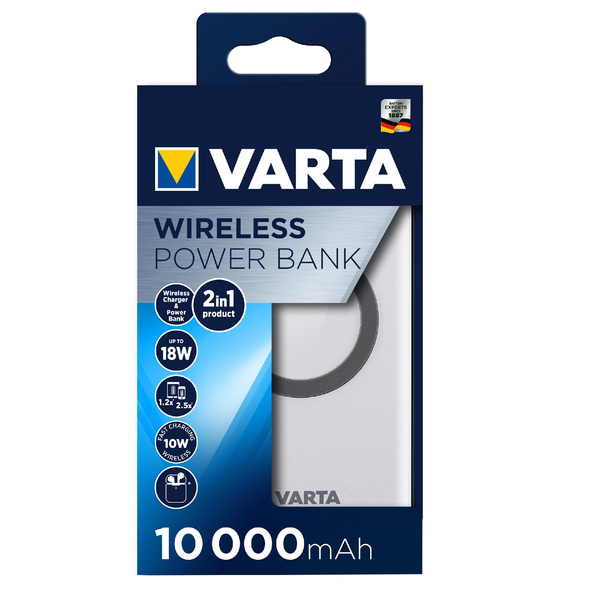 - Ciesz się maksimum wygody i niezależności z Wireless Power Bank od VARTA! 10W szybkiego, bezprzewodowego ładowania, USB typu C PD oraz Quick Charge zapewniają najwyższą prędkość ładowania!