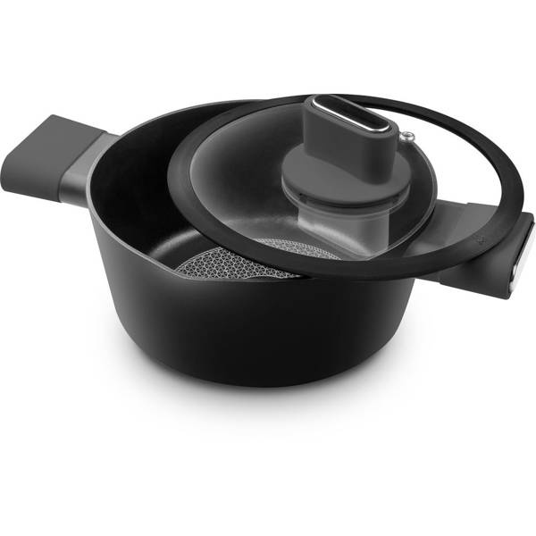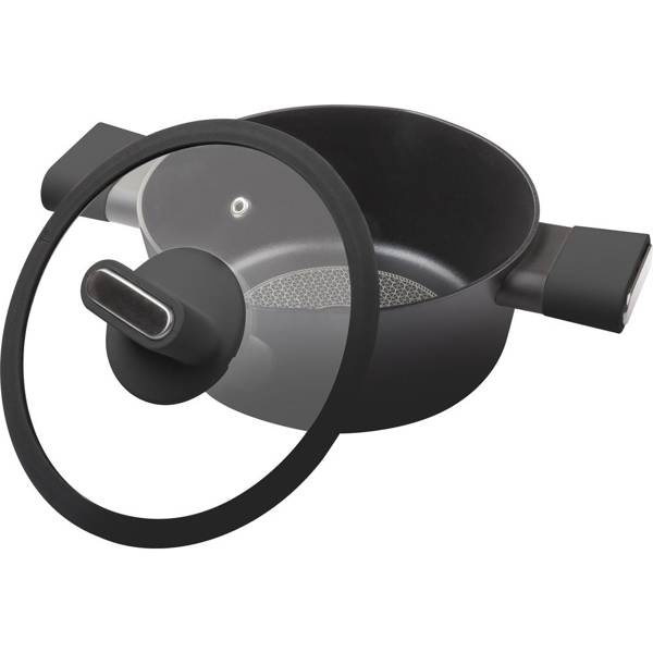 Wyprodukowano z wysoce odpornego aluminium. Garnek z powierzchnią wewnętrzną odporną na zadrapania i przypalanie, z grubym dnem i uchami z osłoną silikonową. Nieprzywierający materiał bez zastosowania PFOA (w przypadku przegrzania nie uwalniają się żadne toksyczne substancje) o wysokiej odporności termicznej, przeciwdziała przypalaniu, zdrowe gotowanie. Pokrywka z odpornego szkła z otworem na parę i silikonową krawędzią, zapewniająca doskonałą kontrolę podczas gotowania. Łatwa konserwacja i czyszczenie.