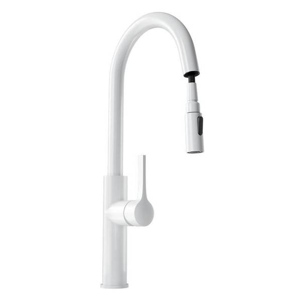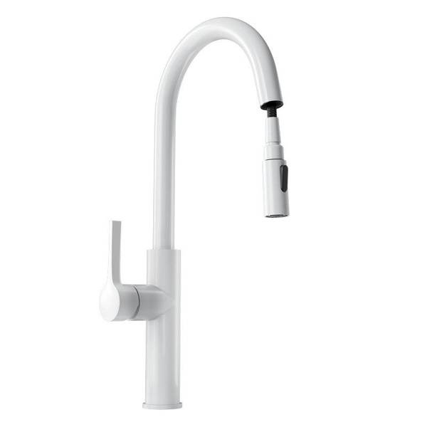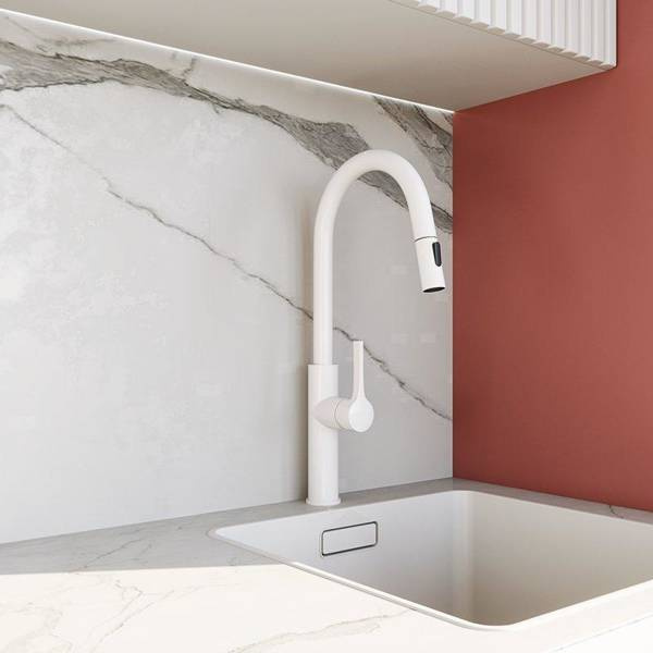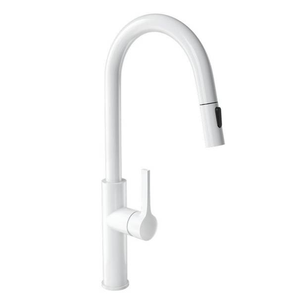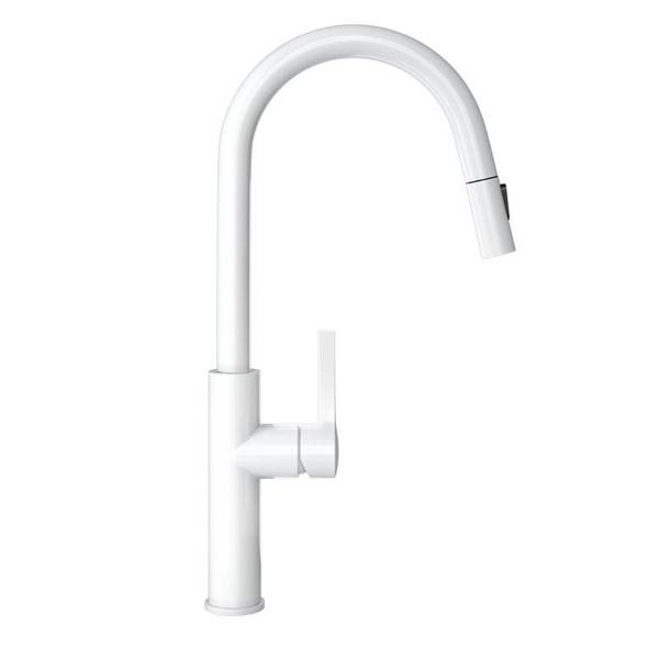 Krótki opis: bateria kuchenna z wyciąganą wylewką. Wykonanie: mosiądz. Uchwyt: stop cynku. Linia: Design Biały bateria kuchenna z wyciąganą wylewką Bateria kuchenna Divio White zachwyca pięknym designem i funkcjonalnością. Została wykonana z dbałością o szczegóły, dlatego doskonale uzupełni kuchenną przestrzeń. Ogromną zaletą baterii jest wyciągana wylewka z solidnym mocowaniem, która pozwoli zadbać o najwyższy komfort zmywania. Elegancki, stylowy kształt i biały kolor sprawiają, że bateria znajdzie zastosowanie zarówno w nowoczesnych, jak i klasycznych kuchniach. Zestaw zawiera: bateria, wężyki, zestaw mocujący, uszczelki. Zalety i korzyści dla użytkownika Wygodna w użytkowaniu - Divio to bateria z wyciąganą wylewką. Dzięki tej funkcji możesz skierować strumień wody, tam gdzie tego potrzebujesz. Wygodnie umyjesz naczynia, sprzątniesz strefę wokół zlewu, czy napełnisz wysoki garnek wodą. Wyjątkowe wzornictwo - bateria zlewozmywakowa Divio jest wykończona w kolorze białym, dlatego będzie eleganckim akcentem w kuchni. Trwała konstrukcja - zastosowany do produkcji baterii mosiądz cechuje się wysoką odpornością, co pozwoli użytkować baterię przez długie lata. Malowanie metodą PVD zwiększa odporność na zarysowanie, dzięki czemu przy odpowiedniej pielęgnacji nawet po długim czasie bateria będzie prezentować się jak nowa. Przeznaczenie: Bateria przeznaczona jest do użytku ze zlewozmywakami kuchennymi. Może być również montowana bezpośrednio na blacie. Materiały: Bateria została wykonana z mosiądzu, na który naniesiona została powłoka PVD w kolorze białym. Uchwyt jest ze stopu cynku. ID#