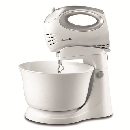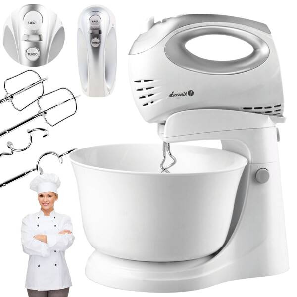 - MOC 300 W, 2 PARY MIESZADEŁ, OBROTOWA MISA O POJ. 3 L - DAJE MOŻLIWOŚĆ PRACY TYLKO MIKSEREM RĘCZNYM