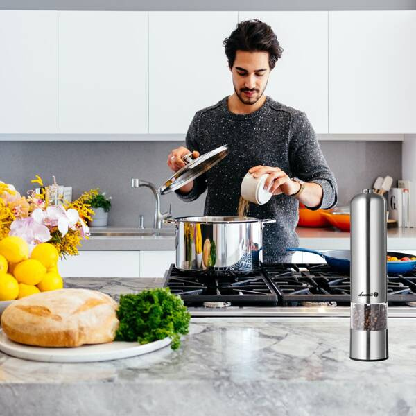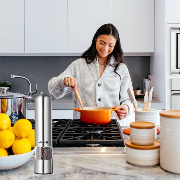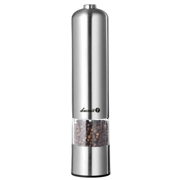 - Elektryczny młynek z ceramicznym mechanizmem, posiada regulację grubości mielenia oraz lampkę podświetlającą. Idealny do mielenia soli, pieprzu oraz innych przypraw,obudowa chromowana. Zasilanie: 4x bateria AA.