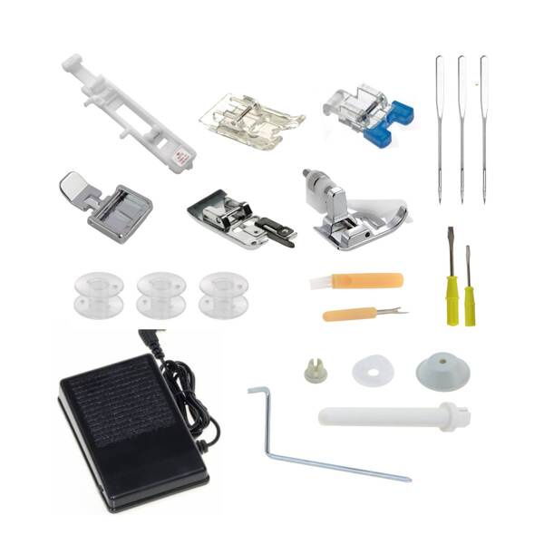 Igła 90 (3 szt.), Prujka ze szczoteczką, Oliwiarka, Śrubokręt (2szt.), Szpulka (3 szt.), Trzpień szpulki, Podkladka pod szpulkę, Ogranicznik na trzpień (mały i duży), Pokrowiec przeciwkurzowy, Prowadnik do pikowania