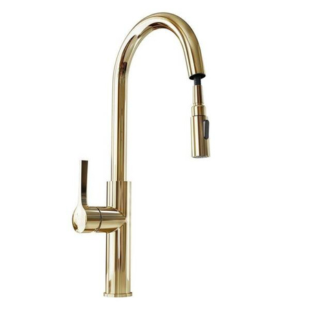 Krótki opis: bateria kuchenna w wyciąganą wylewką. Wykonanie: mosiądz. Uchwyt: stop cynku. Linia: EXCLUSIVE Złota bateria zlewozmywakowa z wyciąganą wylewką Złota bateria kuchenna Divio zachwyca pięknym designem i funkcjonalnością. Została wykonana z dbałością o szczegóły, dlatego doskonale uzupełni kuchenną przestrzeń. Ogromną zaletą baterii jest wyciągana wylewka z solidnym mocowaniem, która pozwoli zadbać o najwyższy komfort zmywania. Elegancki, stylowy kształt, kolor jasnego złota i błyszczące wykończenie sprawiają, że bateria znajdzie zastosowanie zarówno w nowoczesnych, jak i klasycznych kuchniach. Zestaw zawiera: bateria, wężyki, zestaw mocujący, uszczelki. Zalety i korzyści dla użytkownika Wygodna w użytkowaniu - Divio to bateria z wyciąganą wylewką. Dzięki tej funkcji możesz skierować strumień wody, tam gdzie tego potrzebujesz. Wygodnie umyjesz naczynia, sprzątniesz strefę wokół zlewu, czy napełnisz wysoki garnek wodą. Wyjątkowe wzornictwo - bateria zlewozmywakowa Divio jest wykończona w kolorze jasnego złota, dlatego będzie eleganckim akcentem w kuchni. Trwała konstrukcja - zastosowany do produkcji baterii mosiądz cechuje się wysoką odpornością, co pozwoli użytkować baterię przez długie lata. Malowanie metodą PVD zwiększa odporność na zarysowanie, dzięki czemu przy odpowiedniej pielęgnacji nawet po długim czasie bateria będzie prezentować się jak nowa. Przeznaczenie: Bateria przeznaczona jest do użytku ze zlewozmywakami kuchennymi. Może być również montowana bezpośrednio na blacie. Materiały: Bateria została wykonana z mosiądzu, na który naniesiona została powłoka PVD w kolorze jasnego złota. Uchwyt jest ze stopu cynku. Dobrze wiedzieć! Bateria Divio Light Gold będzie znakomicie prezentować się w towarzystwie złotego okapu GLOBALO w odcieniu Light Gold. ID#448