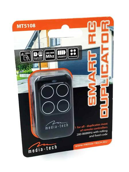 Uniwersalny pilot samokopiujący SMART RC DUPLICATOR MT5108 - 1 do wszystkich – duplikuje większość pilotów 280-868MHz z kodem zmiennym i stałym. SMART RC DUPLICATOR obsługuje szeroki zakres częstotliwości, dzięki czemu jest najbardziej uniwersalnym pilotem dostępnym na rynku, zdolnym do skopiowania ponad 300 różnych modeli pilotów. Pilot 4 kanałowy pracujący w częstotliwości 280-868MHz. Umożliwia łącznie skopiowanie pięciu kodów (możliwe jest skonfigurowanie dwóch przycisków jednocześnie, które będą działać jako jeden oddzielny, piąty kanał). Jeśli masz dwa, trzy różne piloty pracujące w różniej częstotliwości, z różnymi kodami, możesz obsłużyć je wszystkie jednym pilotem SMART RC DUPLICATOR MT5108 , konfigurując przyciski odpowiadające za każdego pilota. Główne cechy i funkcje pilota: Kopiowanie pilotów z kodem stałym, zmiennym oraz dynamicznym Wysoka kompatybilność z pilotami innych producentów - kopiowanie ponad 300 różnych marek pilotów (dokładna lista jest dostępna na stronie internetowej www.media-tech.eu) Zakres częstotliwości pracy: 280-868MHz Możliwość zaprogramowanie każdego przycisku pod inny pilot Obudowa wykonana z materiału odpornego na zachlapanie wodą Automatyczne skanowanie oryginalnego pilota i dostosowywanie do wykrytej częstotliwości Cztery kanały, do skopiowania łącznie pięciu kodów (możliwe jest skonfigurowanie dwóch przycisków jednocześnie, które będą działać jako jeden oddzielny, piąty kanał) Duży zasięg pracy - 100-150m Pilot SMART RC DUPLICATOR MT5108 jest idealnym rozwiązaniem dla osób, które np. posiadają jeden działający pilot i chcą dorobić do niego kolejne zapasowe duplikaty lub przekazać kopie innym osobom. Pilot kopiuje sygnały w takich urządzeniach jak: Drzwi garażowe Bramy do posesji Produkty Smart Home Produkty użytku domowego Pilot nadaje się do kopiowania sygnału nie tylko bram wjazdowych, ale także innych urządzeń domowych, takich jak np. automatyczne rolety czy zdalne włączniki oświetlenia. Gwarancja producenta