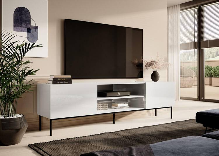 Szafka RTV SLIDE 200K na czarnym stelażu ze stali 200x40xH57 cała w białym połysku