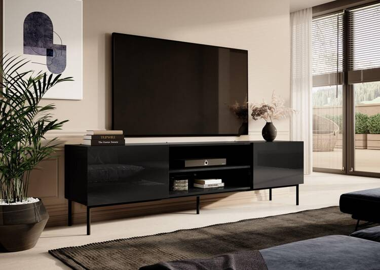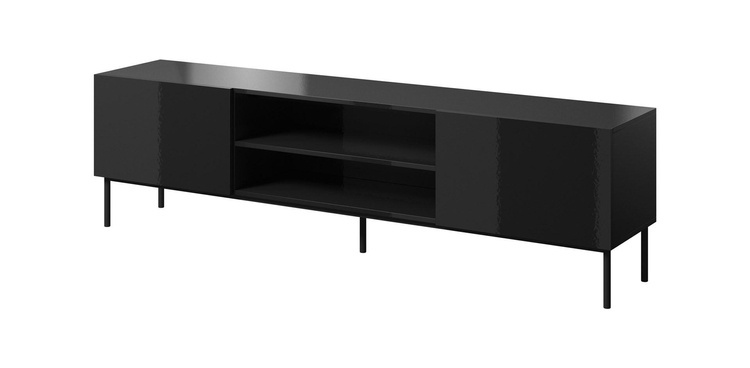 Szafka RTV SLIDE 200K na czarnym stelażu ze stali 200x40xH57 cała w czarnym połysku