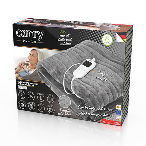- Elektryczny koc nakładany Camry 7434 zapewnia ciepło i komfort wypoczynku, umożliwia otulenie ciała z powodu wyjątkowej miękkości tkaniny oraz ogromnego rozmiaru 160x180cm. Jest również wskazane dla osób dbających o zdrowie. Uśmierza nerwobóle, koi zeszt