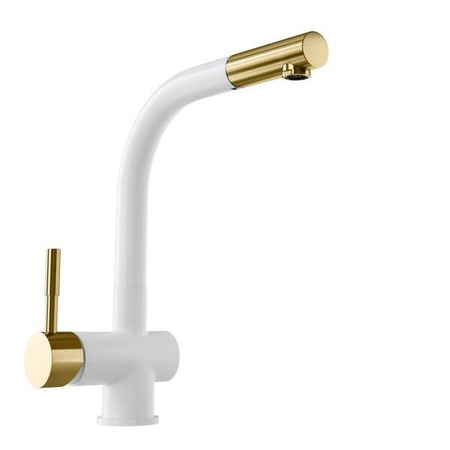Krótki opis: bateria kuchenna z wyciąganą wylewką. Wykonanie: mosiądz. Uchwyt: stop cynku. Linia Design Biała bateria kuchenna ze złotą wyciąganą wylewką Wybierz Lobio White/Light Gold Mat Ring i ciesz się pięknem i stylem, ale także niezrównaną funkcjonalnością w Twojej kuchni. To nie tylko bateria, to element, który podniesie komfort codziennych czynności i nada Twojej kuchni charakteru. Zamów już dziś i przekonaj się, jak wiele może zmienić jeden dobrze wybrany detal. Ogromną zaletą baterii jest wyciągana wylewka z solidnym mocowaniem, która pozwoli zadbać o najwyższy komfort zmywania. Elegancki, stylowy kształt sprawiają, że bateria znajdzie zastosowanie zarówno w nowoczesnych, jak i klasycznych kuchniach. Trwałość i Niezawodność Dzięki wykonaniu z wysokiej jakości mosiądzu i zastosowaniu powłoki PVD w kolorze złotym, bateria kuchenna Lobio gwarantuje długotrwałe użytkowanie bez obawy o uszkodzenia czy utratę koloru. Inwestycja w Lobio to gwarancja satysfakcji na lata. Ekskluzywne Detale – matowa złota końcówka i uchwyt Dodaj swojej kuchni wyjątkowego blasku dzięki przemyślanym detalom baterii Lobio White/Light Gold Mat Ring. Złota końcówka wylewki nie tylko podkreśla elegancję i unikalny styl tego produktu, ale także zapewnia trwałość i odporność na codzienne użytkowanie. Uchwyt do regulacji wody, również wykończony złotą powłoką, oferuje precyzyjną kontrolę nad temperaturą i siłą strumienia, łącząc w sobie funkcjonalność z niepowtarzalnym designem. Te złote akcenty są nie tylko praktyczne, ale także stanowią wyrafinowaną ozdobę, która wyróżni Twoją kuchnię na tle innych. Wybierając baterię Lobio, decydujesz się na produkt, w którym każdy detal został zaprojektowany z myślą o zadowoleniu użytkownika i estetyce przestrzeni. Zalety i korzyści dla użytkownika Wygodna w użytkowaniu dzięki wyciąganej wylewce Precyzyjne kierowanie strumieniem wody, tam gdzie tego potrzebujesz. Wygodnie umyjesz naczynia, sprzątniesz strefę wokół zlewu, czy napełnisz wysoki garnek wodą. Wyjątkowe wzornictwo i wykończenie w kolorze białym i złotym Trwała konstrukcja - zastosowany do produkcji baterii mosiądz cechuje się wysoką odpornością, co pozwoli użytkować baterię przez długie lata. Przeznaczenie: Bateria przeznaczona jest do użytku ze zlewozmywakami kuchennymi. Może być również montowana bezpośrednio na blacie. Zestaw zawiera: bateria, wężyki, zestaw mocujący, uszczelki. ID#