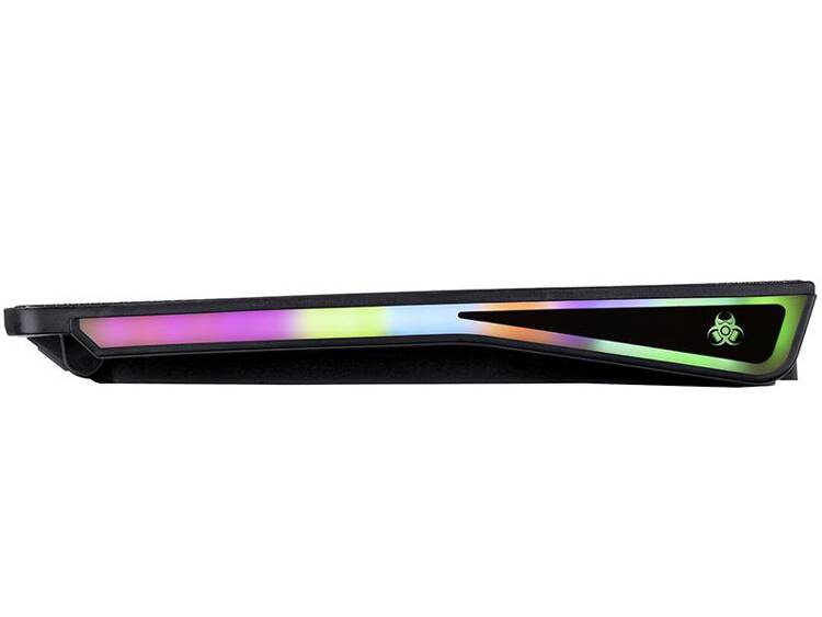 Unikalny wygląd stacja zawdzięcza wysokiej jakości tworzywu i zmiennemu podświetleniu RGB LED. Stacja spokojnie pomieści nawet duże notebooki o przekątnej ekranu 17,3 cali. Laptop zabezpieczony jest przed zsuwaniem się ze stacji szerokimi blokadami.