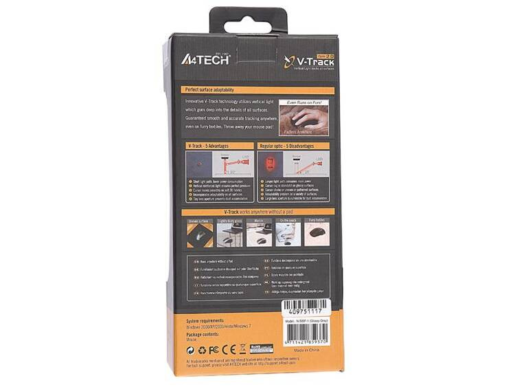 - Najnowsza przewodowa mysz A4Tech z serii Office. Wyróżnia ją innowacyjna technologia V-Track - dzięki wzmocnionej wiązce świetlnej, która wnika głęboko w strukturę podłoża, mysz działa płynnie i dokładnie na każdej powierzchni 3D, takiej jak puchowa narzu