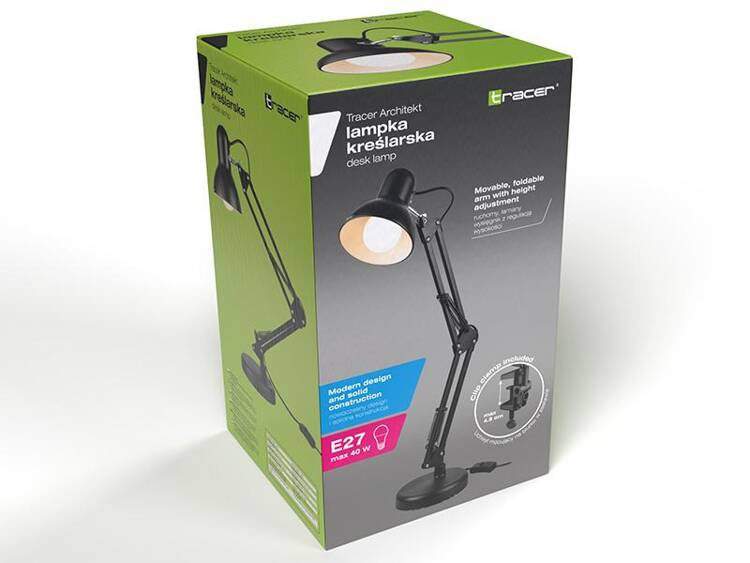 Lampka kreślarska Tracer Architekt to solidnie wykonane urządzenie, które z łatwością przymocujesz do biurka bądź innej poziomej powierzchni, za pomocą stabilnego uchwytu. Dzięki temu możesz mieć pewność, że pracując na niewielkiej przestrzeni, przypadkiem jej nie strącisz. Lampka wyposażona jest w elastyczne ramię, co sprawia, że możesz regulować kąt padania światła aż w trzech przegubach. Pozwoli Ci to dokładnie doświetlić elementy, nad którymi właśnie pracujesz. Regulując kąt nachylenia lampki, możesz również ustawić ją w taki sposób, aby bezpośrednio padające światło nie oślepiało Cię.