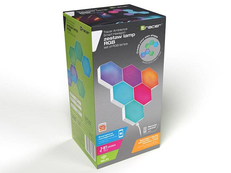 - Zestaw szcześciokątnych lamp TRACER Ambience - Smart Hexagon zagwarantuje Ci odpowiednią oprawę świetlną do każdego wyjątkowego wydarzenia. Stwórz niepowtarzalny nastrój w trakcie sesji gamingowej, koncertu lub seansu filmowego, wykorzystując zdalnie ster