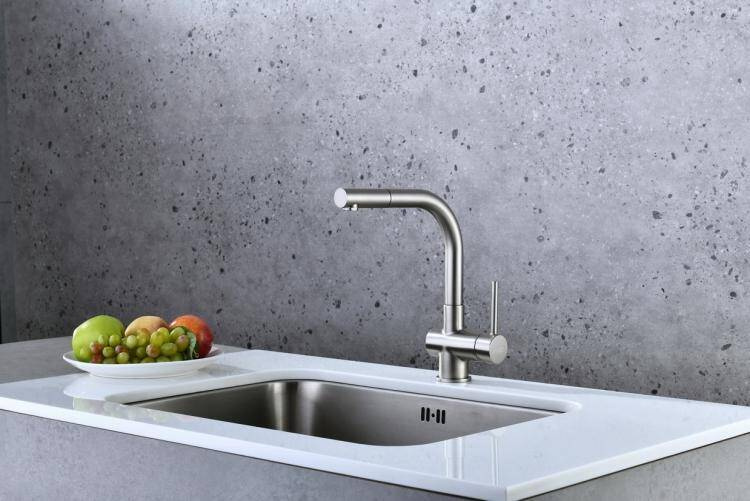 - BATERIA Z WYCIĄGANĄ WYLEWKĄ– wykończenie: kolor STALI– obrotowa wylewka do ok. 165°– głowica ceramiczna– elastyczne wężyki podłączeniowe 3/8“ – 400 mm