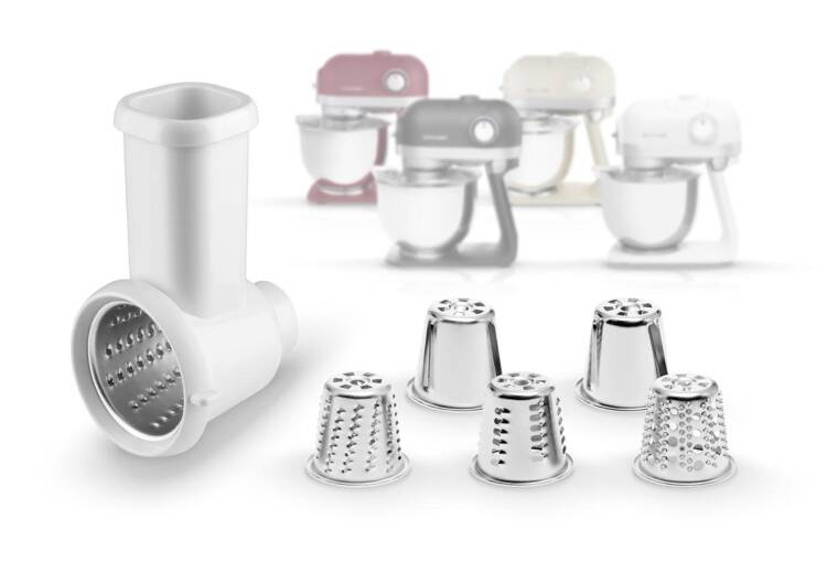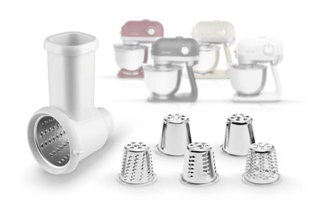 Tarka wyposażona jest w 5 tarcz do tarcia: do tarcia drobnego, tarcia grubego, do krojenia cienkich i grubych plastrów oraz specjalną tarkę do placków ziemniaczanych. Przygotowanie sałatek owocowo-warzywnych i innych ulubionych dań będzie o wiele szybsze i latwiejsze.