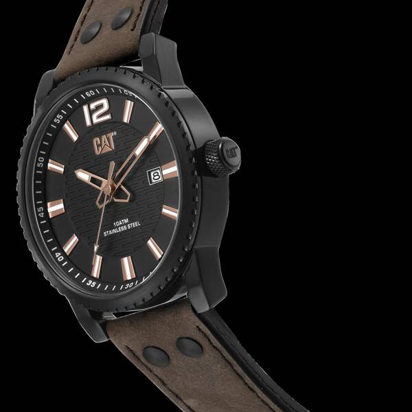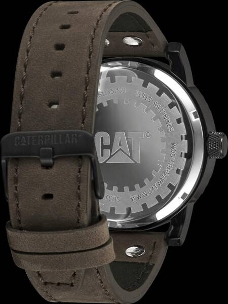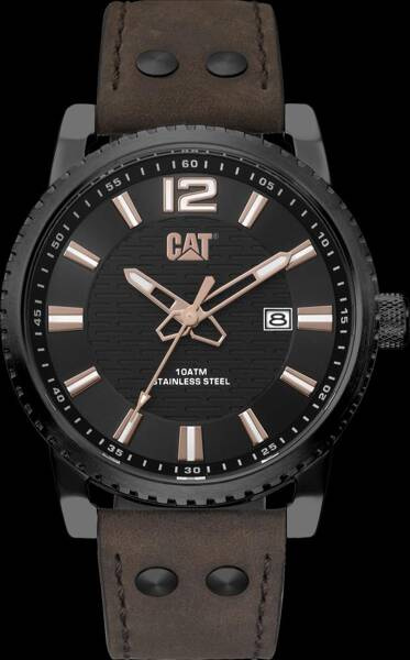 - Zegarek CAT z obudową ze stali nierdzewnej o średnicy 44 mm i grubości 11 mm, kryształem mineralnym, wodoszczelnością do 100 m oraz mechanizmem Citizen 2315. Analogowy wyświetlacz z wskaźnikiem daty, czarną tarczą i brązowym paskiem ze skóry.