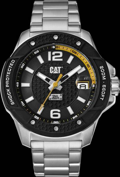 - CAT Zegarek Shockmaster Evo 3H stalowy łączy w sobie wytrzymałość z elegancją, posiadając obudowę ze stali nierdzewnej o średnicy 46,5 mm, kryształy mineralne odporne na zarysowania i wodoodporność do 200 metrów. Mechanizm kwarcowy odporny na wstrząsy.