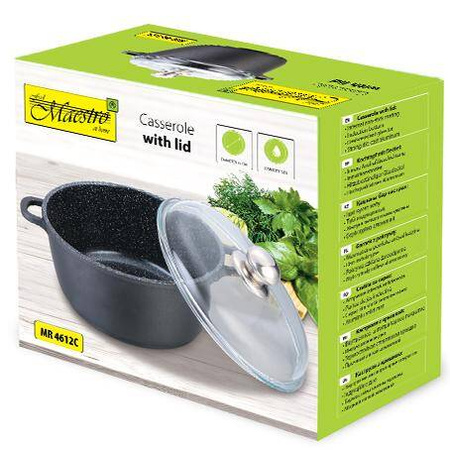 - MR-4628C Garnek z pokrywką 28 cm, 5,8 l • średnica: Ø 28 cm; pojemność: 5,8 l • wysokość: 12,5 cm; szerokość: 29,5 cm • grubość ścianki: 2,5 mm • wewnętrzna powłoka: Granite • można używać w piekarniku do 180° С • do wszystkich typów kuchenek