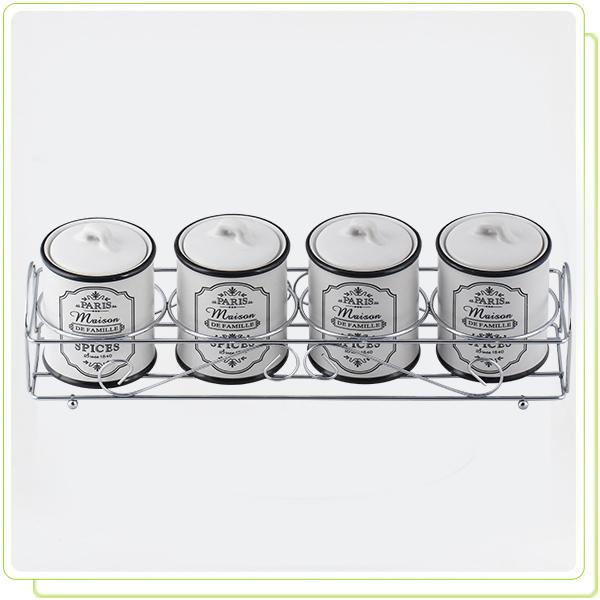 - MR-20030-04СS Zestaw pojemników 5 elementów "PARIS MAISON" • komplet 4 pojemników do przypraw • materiał: ceramika • aluminiowy stojak